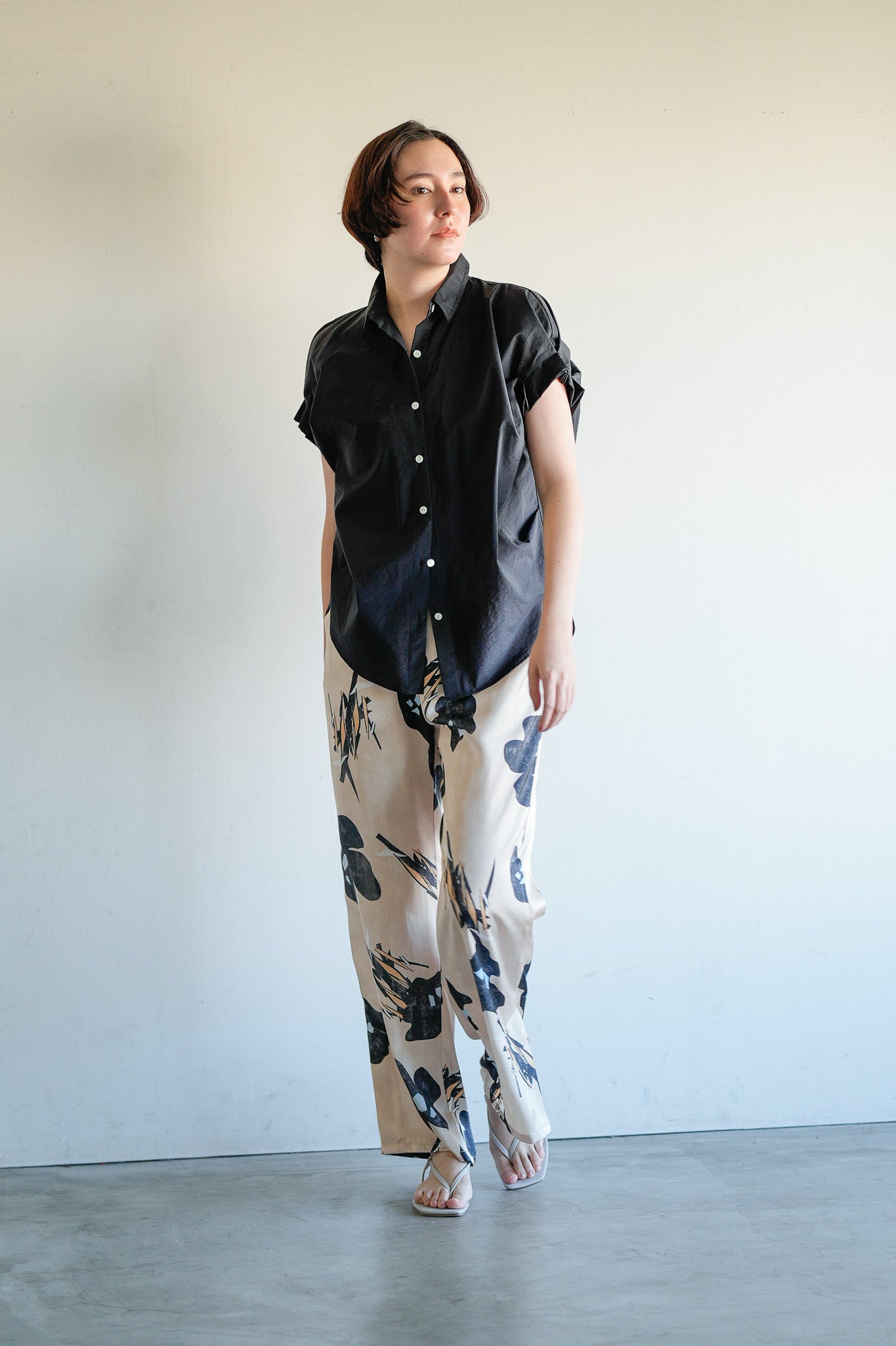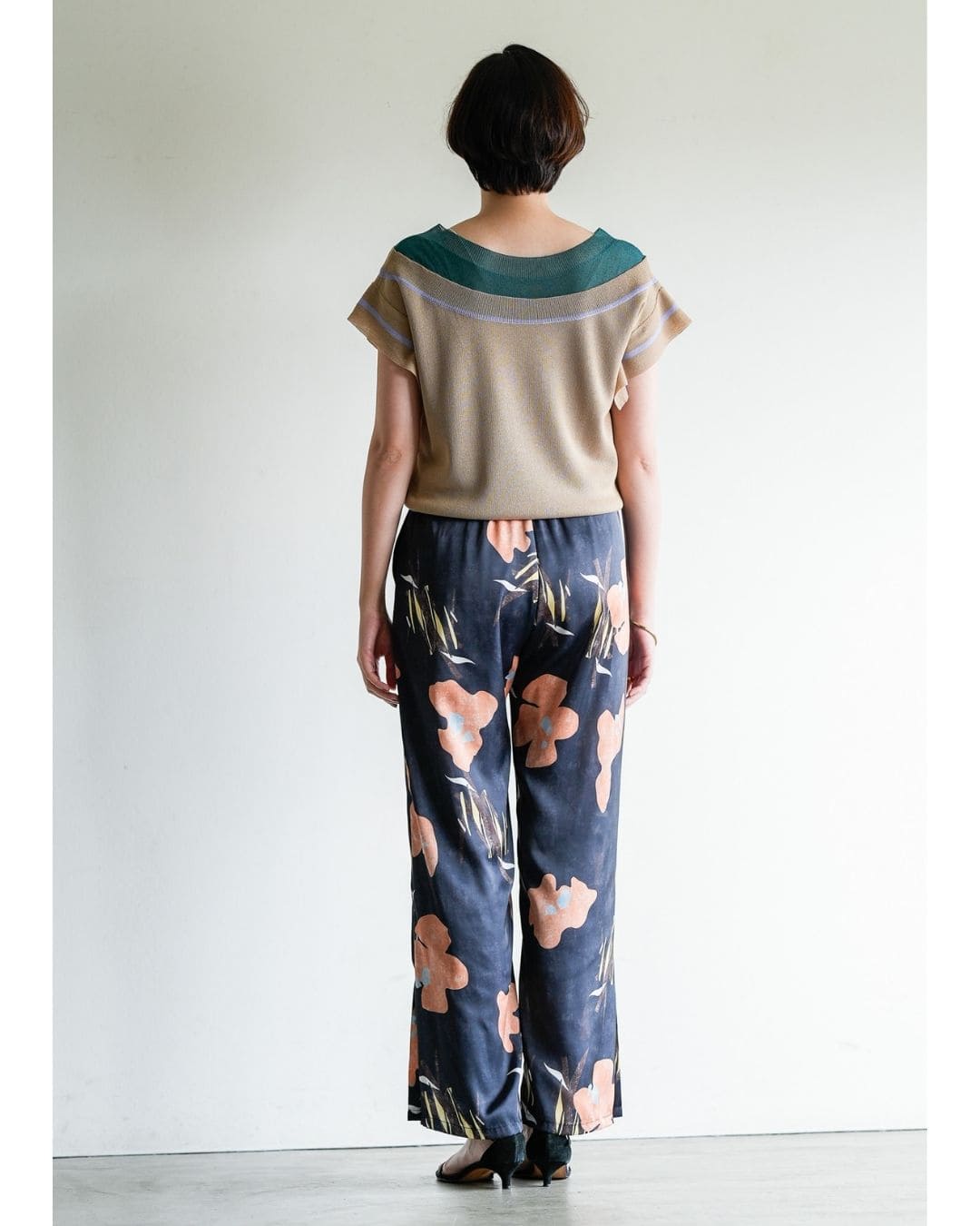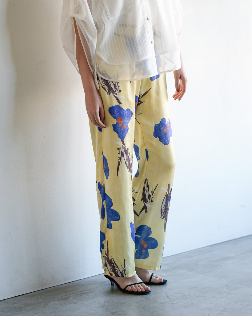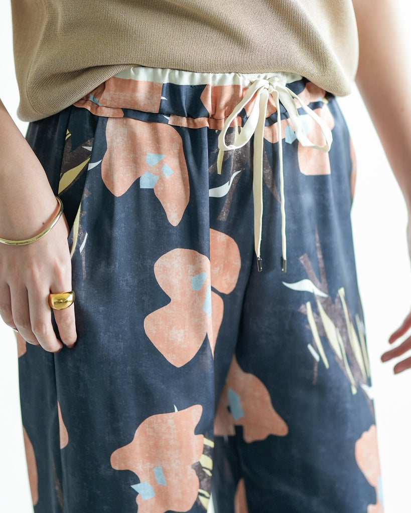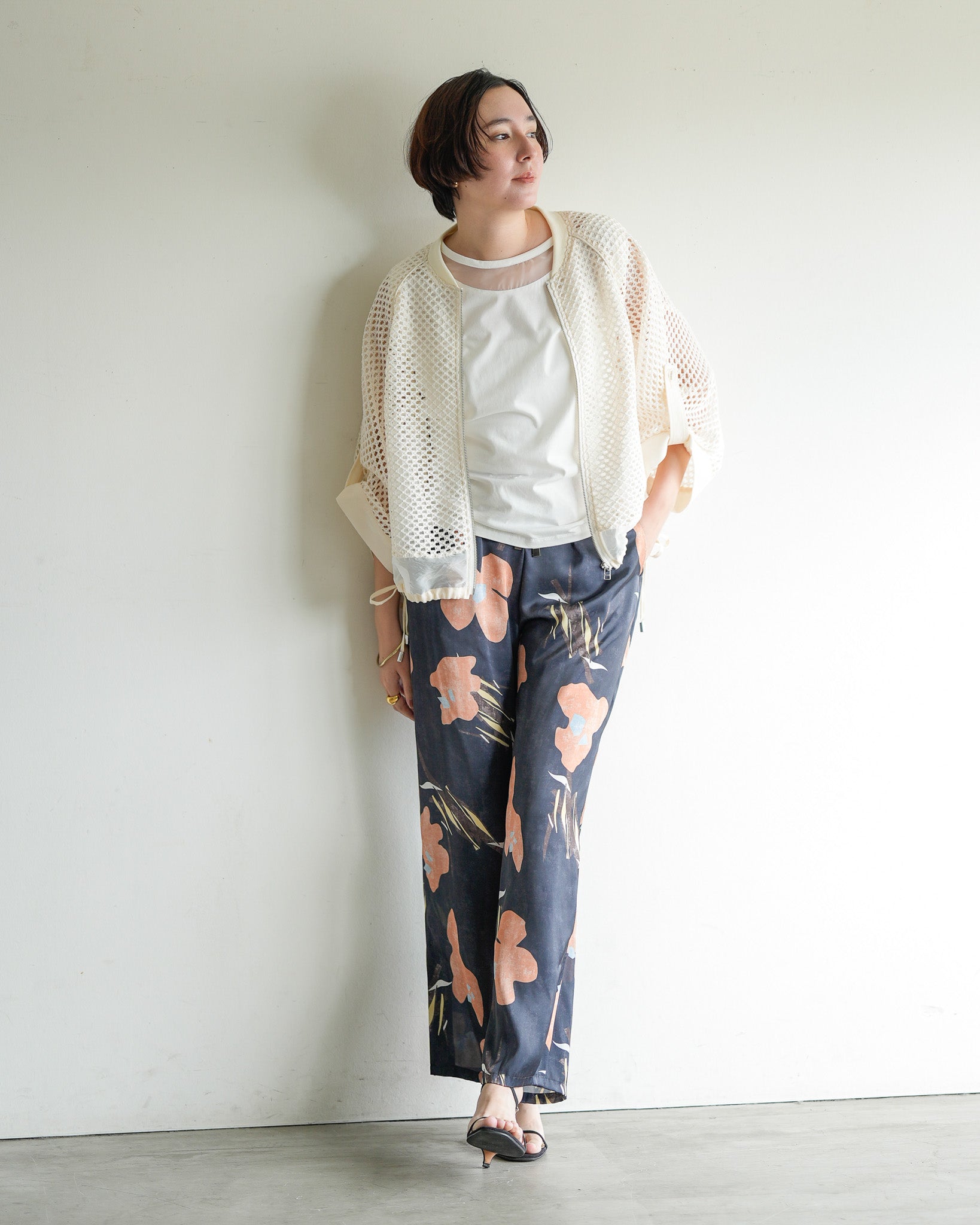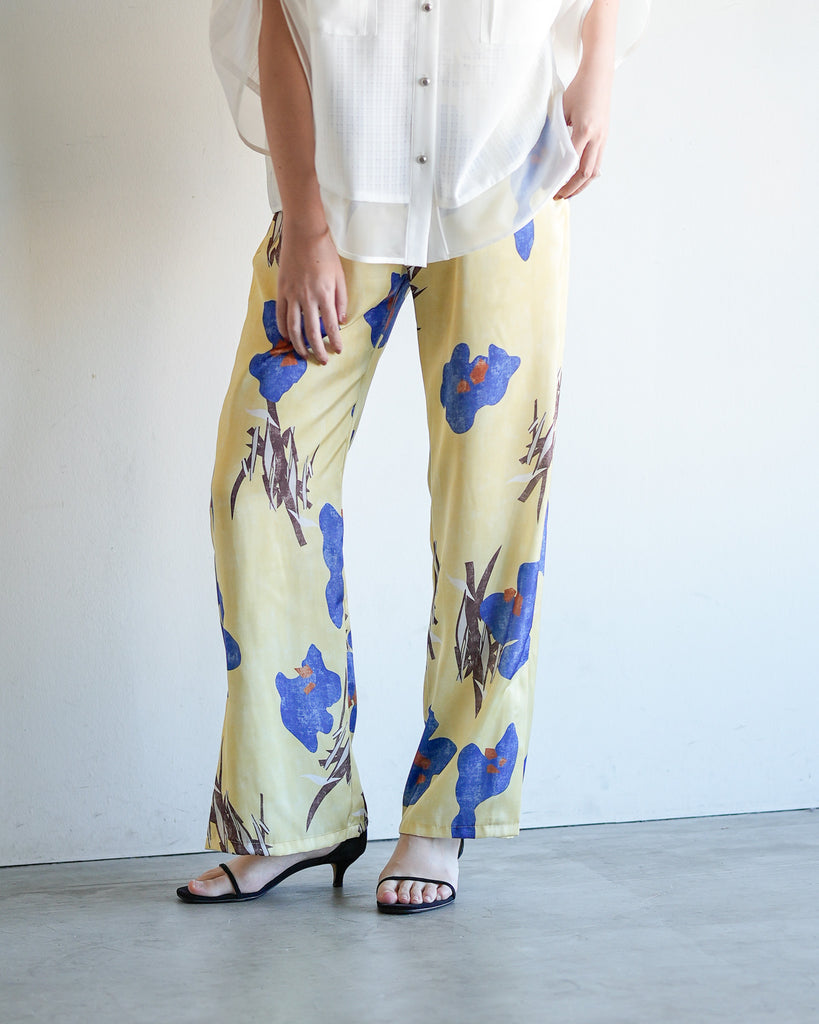 ラリア・ムーの企画チームが一から制作した、オリジナルサテンのプリント生地を使用したイージーパンツ。ウエストは総ゴム仕様で、締め付け感がなくストレスフリーな穿き心地。レッグラインを拾いすぎない生地感と、美脚に見せるパターン設計で、柄のパンツもカジュアルになりすぎず、上品なムードを保ちます。素足が見えにくい仕様の裾のベンツは足元に夏らしい抜け感をプラスしてくれます。