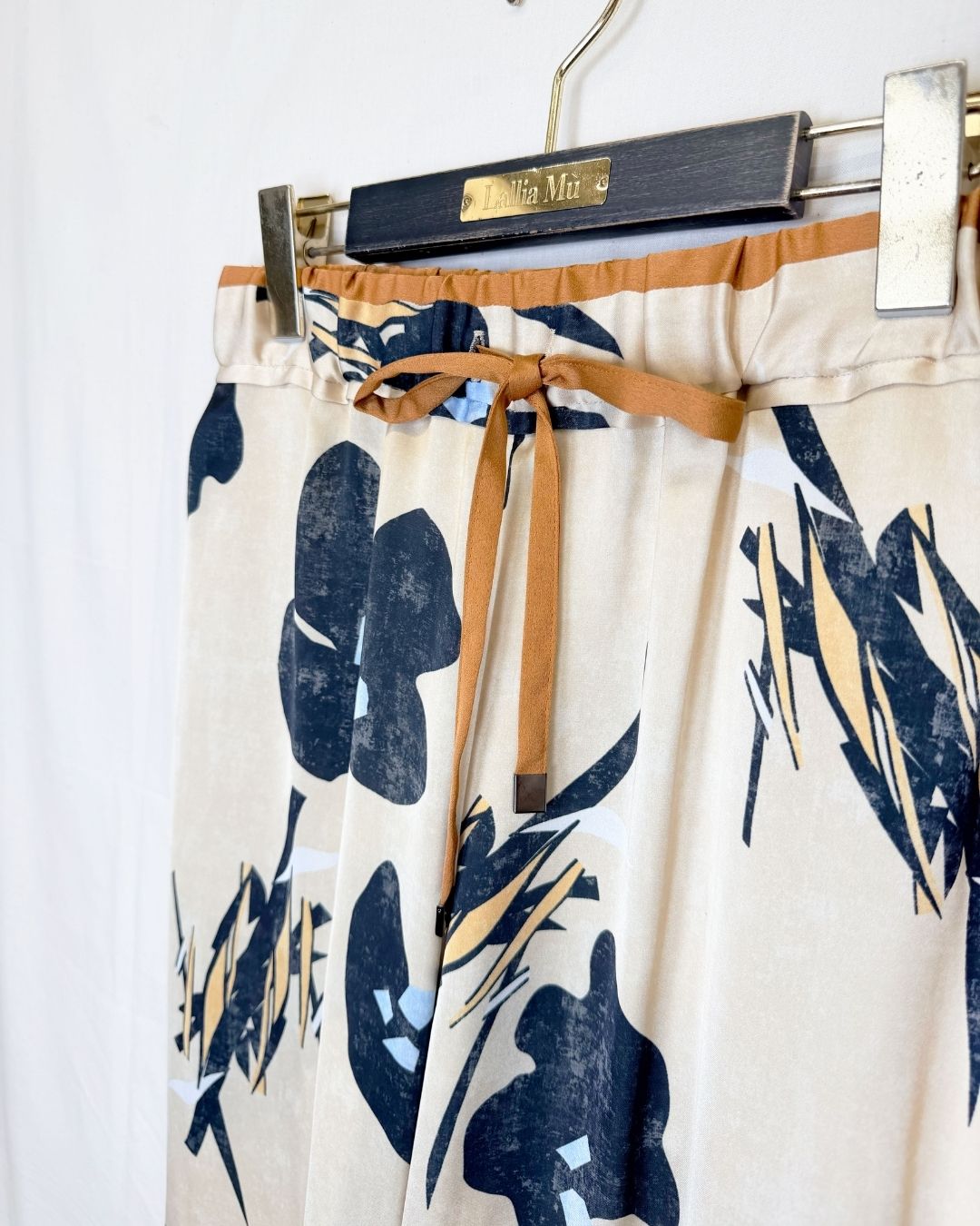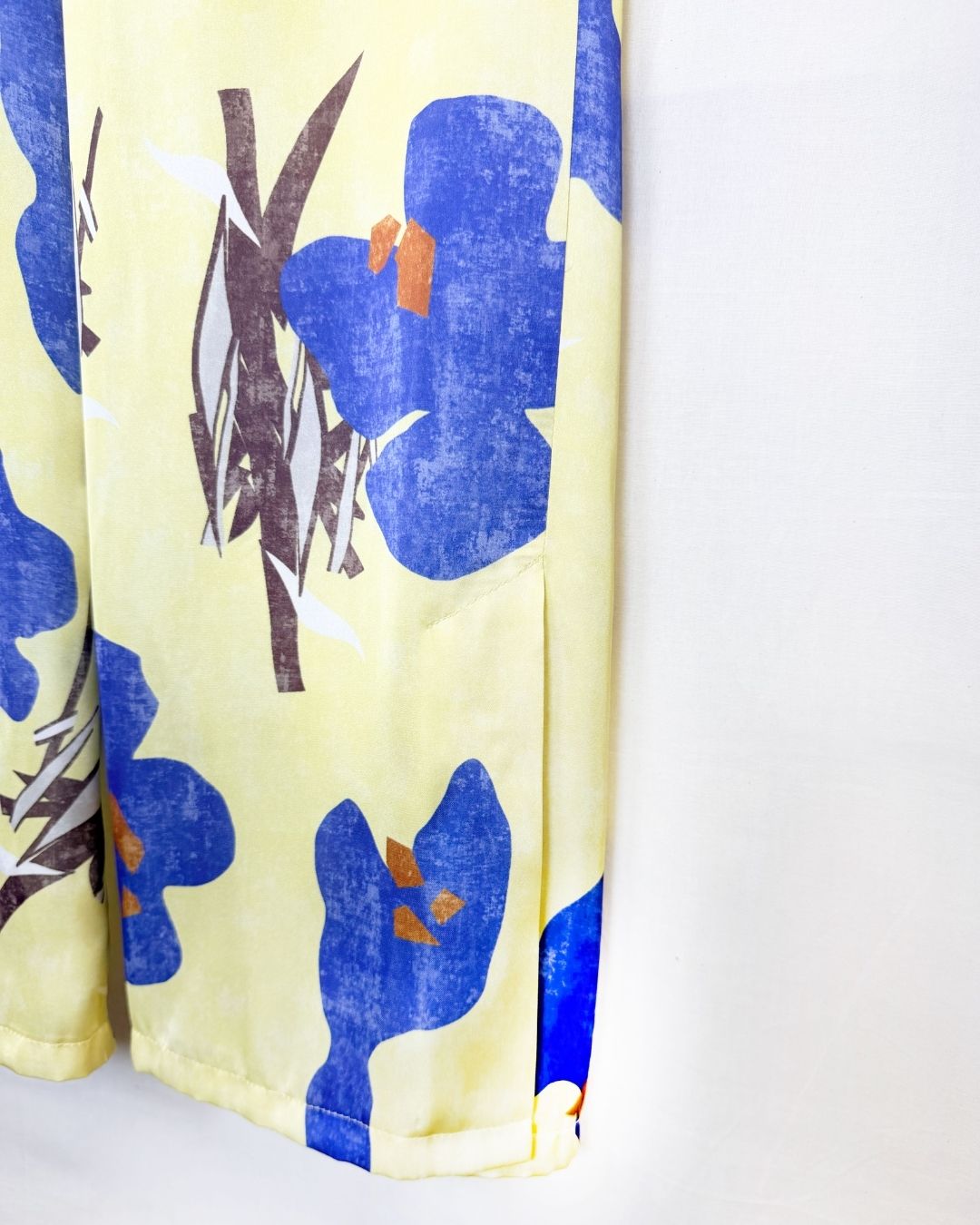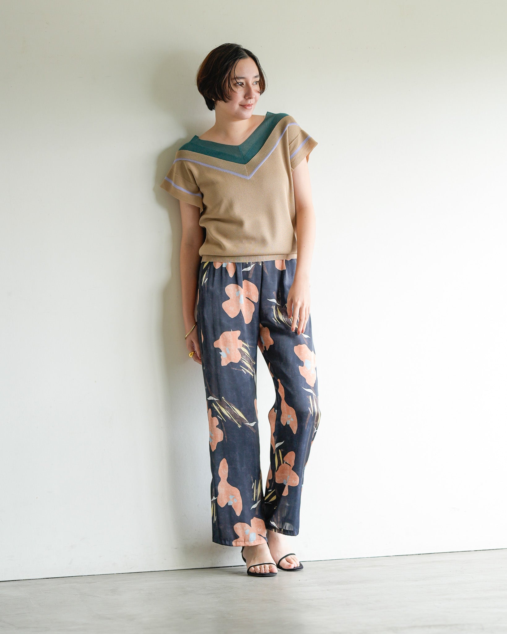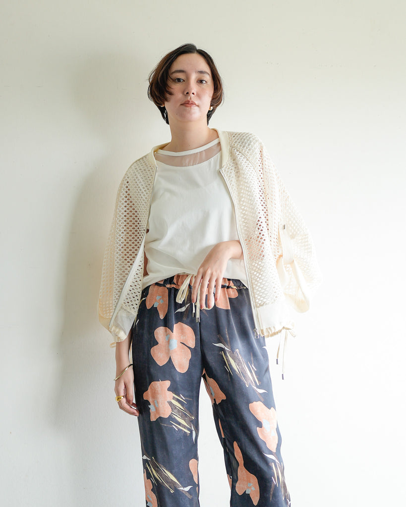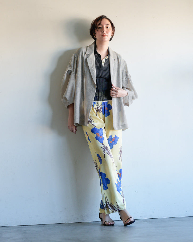 ラリア・ムーの企画チームが一から制作した、オリジナルサテンのプリント生地を使用したイージーパンツ。ウエストは総ゴム仕様で、締め付け感がなくストレスフリーな穿き心地。レッグラインを拾いすぎない生地感と、美脚に見せるパターン設計で、柄のパンツもカジュアルになりすぎず、上品なムードを保ちます。素足が見えにくい仕様の裾のベンツは足元に夏らしい抜け感をプラスしてくれます。