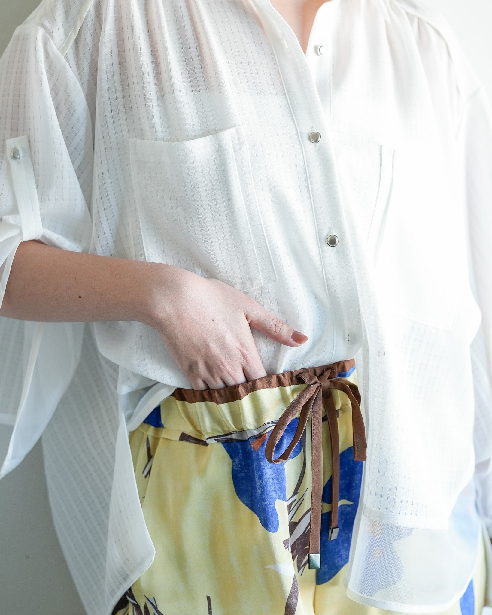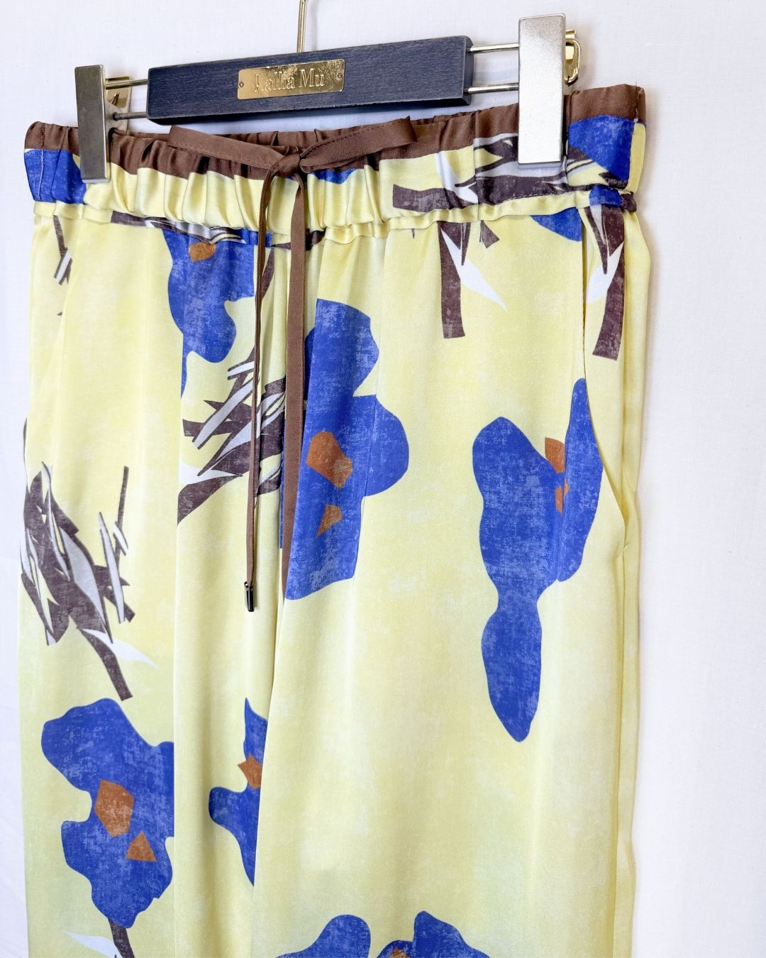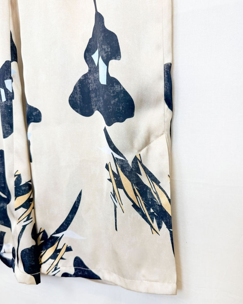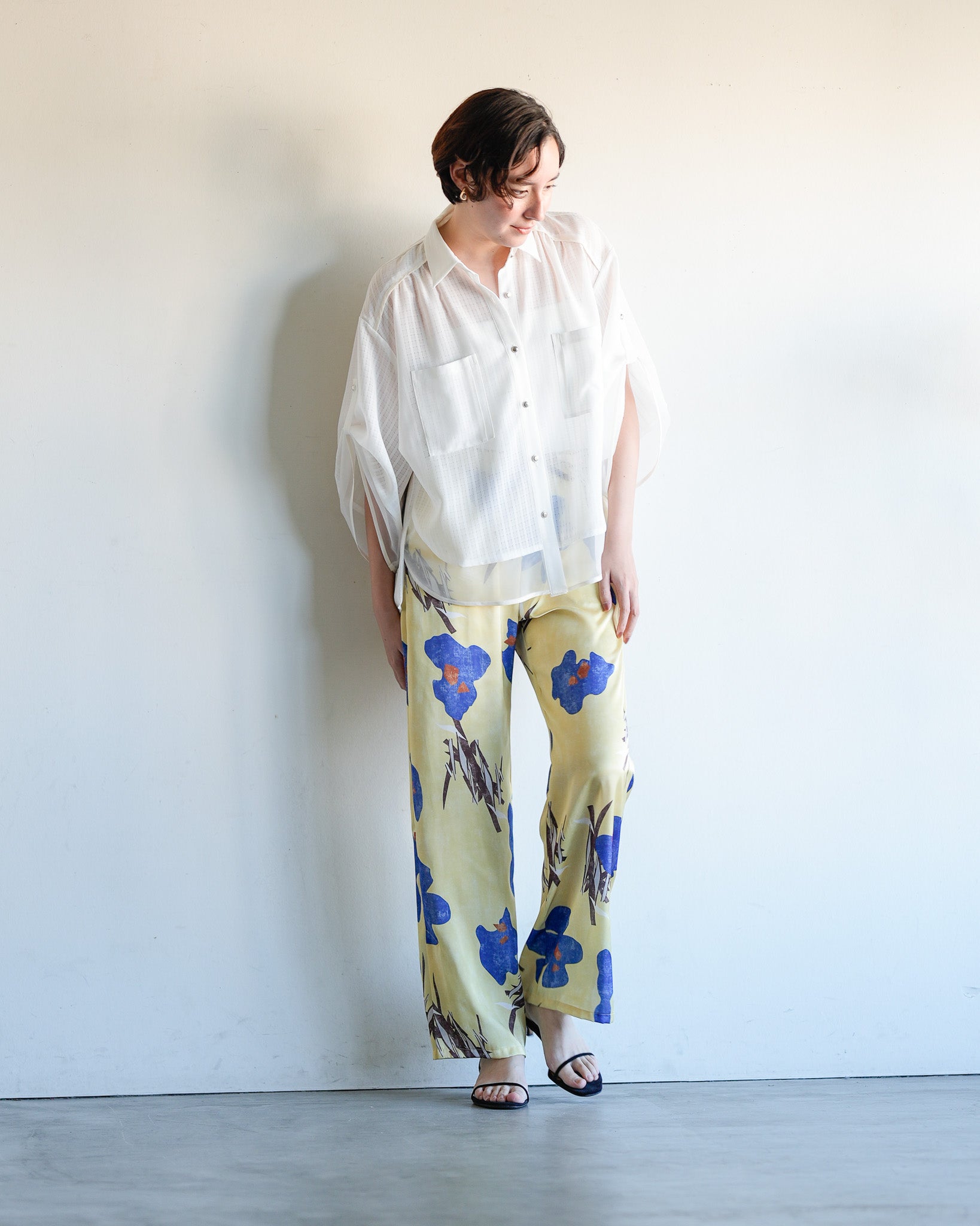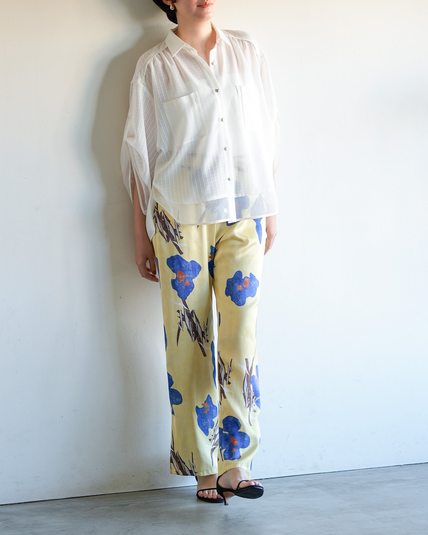 ラリア・ムーの企画チームが一から制作した、オリジナルサテンのプリント生地を使用したイージーパンツ。ウエストは総ゴム仕様で、締め付け感がなくストレスフリーな穿き心地。レッグラインを拾いすぎない生地感と、美脚に見せるパターン設計で、柄のパンツもカジュアルになりすぎず、上品なムードを保ちます。素足が見えにくい仕様の裾のベンツは足元に夏らしい抜け感をプラスしてくれます。