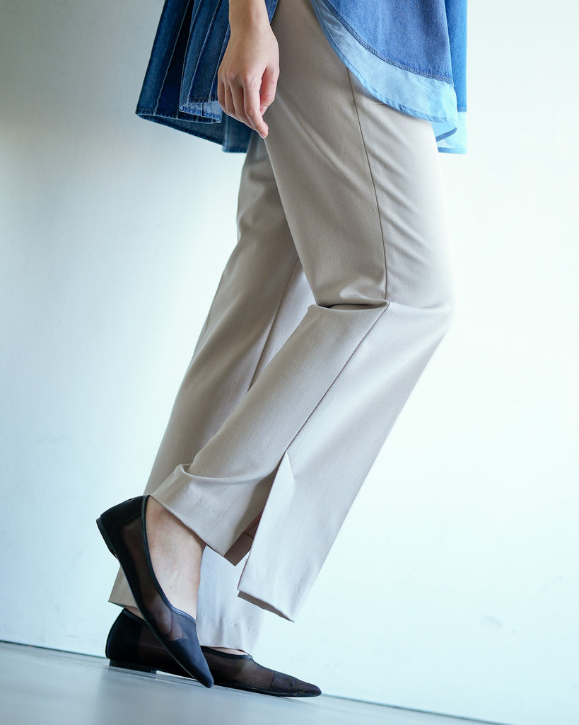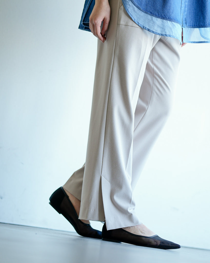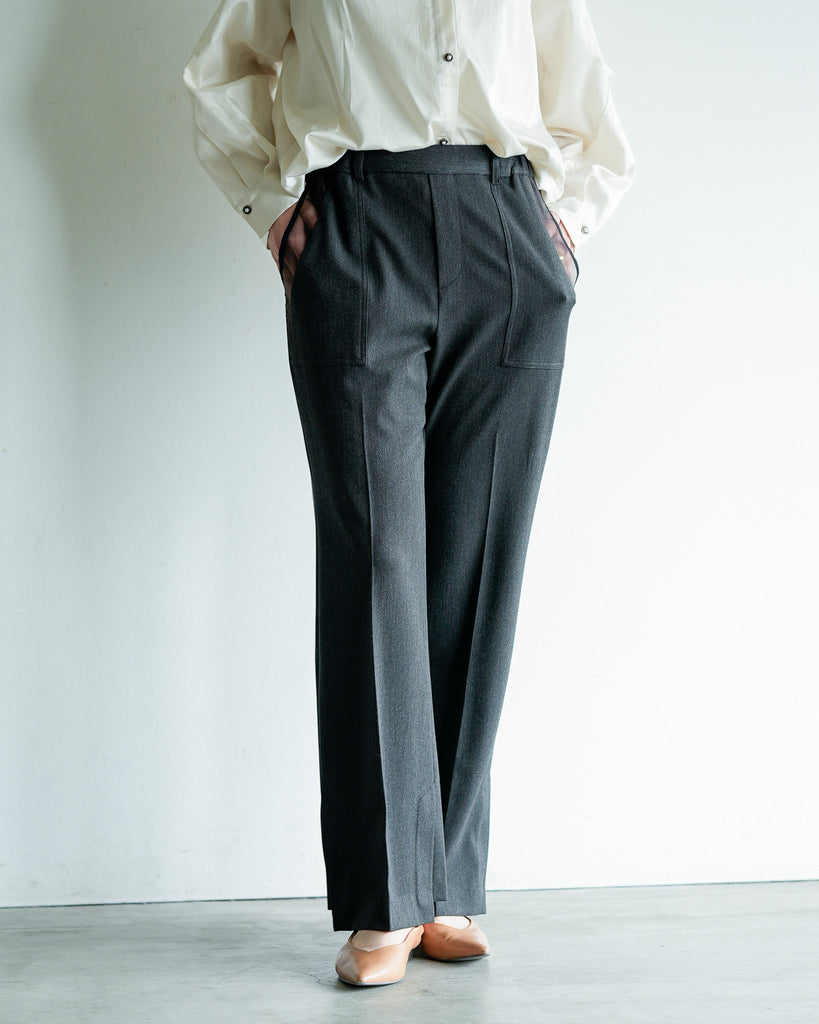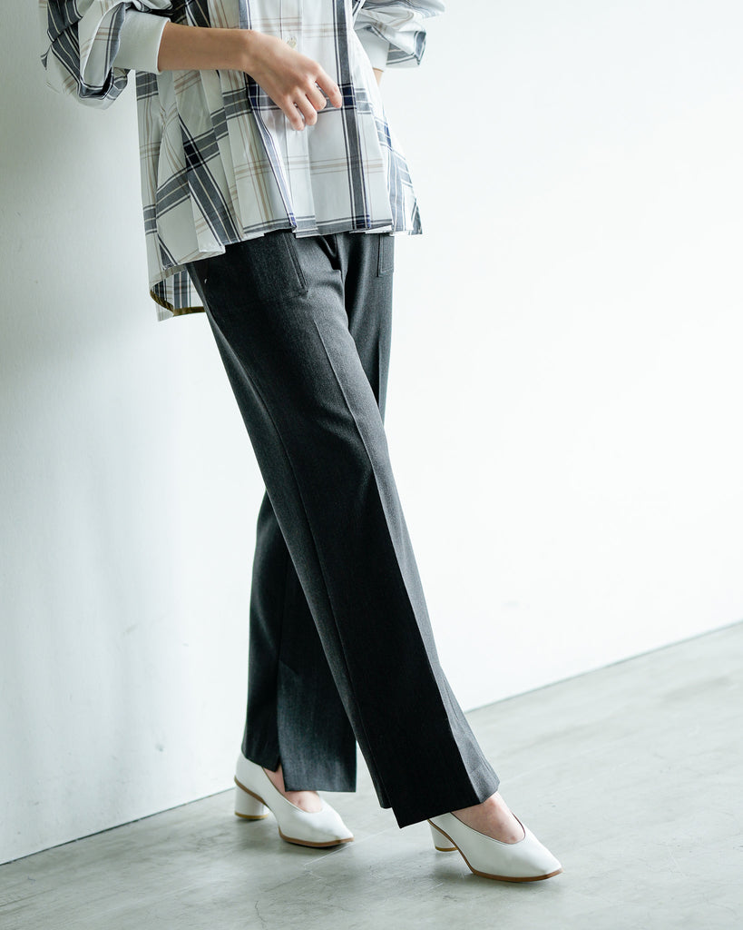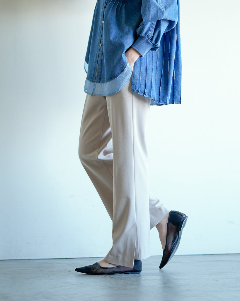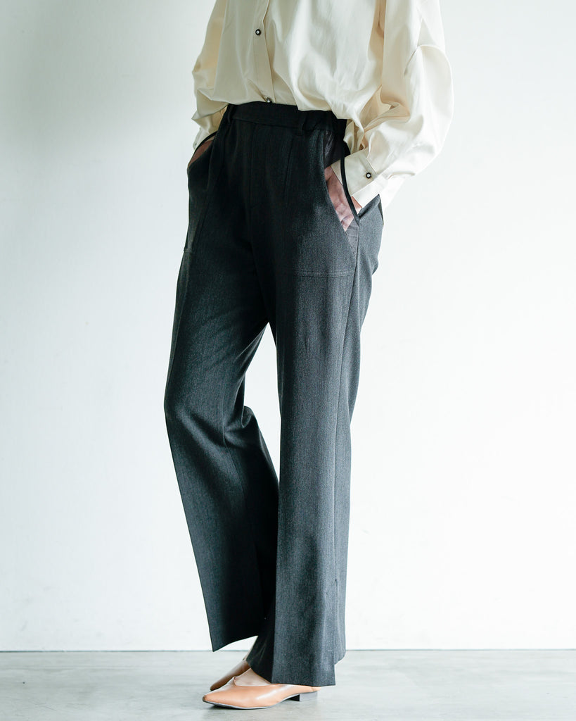楽な着心地でスタイリッシュ見えなイージーパンツ。ソフトな風合いと優れた保温効果を持つ裏起毛素材で、伸縮性に優れ、蒸れにくくしなやかな肌触りが特徴的です。汗など水分を吸収して熱に変える特性を持つため冬も暖かく着用できます。イージーパンツでは特に気になるシルエットにもこだわり、スタイリングしやすいよう広すぎず細すぎずなストレートシルエットを採用。裾の両サイドに入った開きにはスタイルアップを強調する秘訣が。前裾を長く、後裾を短かくし前後の丈差をつけることで(3cm)踵は付かずとも足の甲の部分まで隠れ延長された視覚効果で脚長に。センタープレスが入りきちんと感を与え、日常の様々なシーンで穿けるあったかベーシックボトムです。