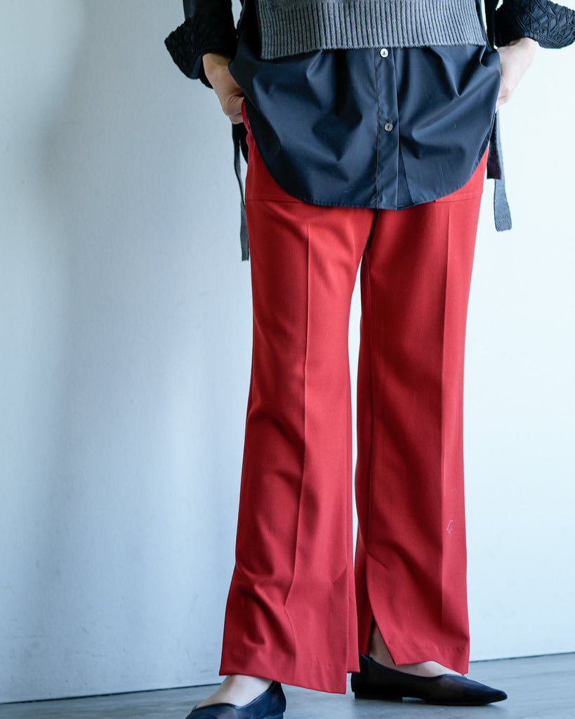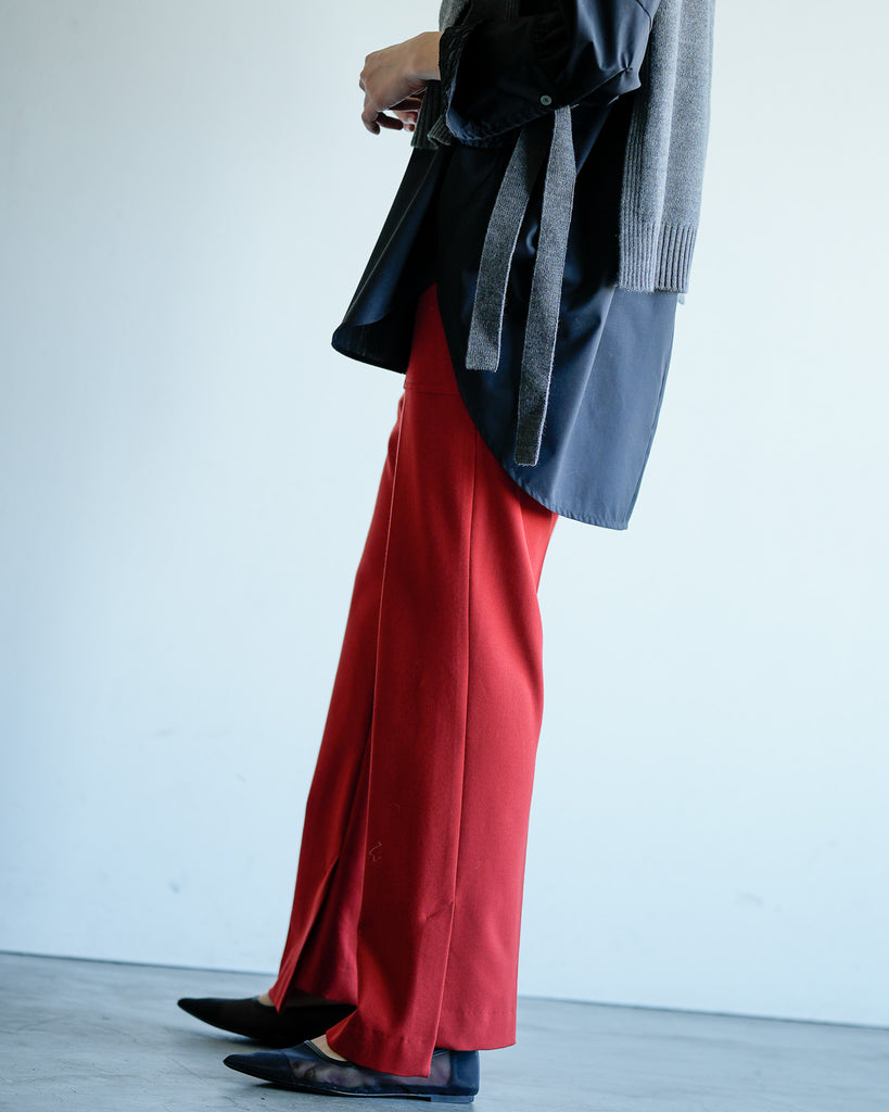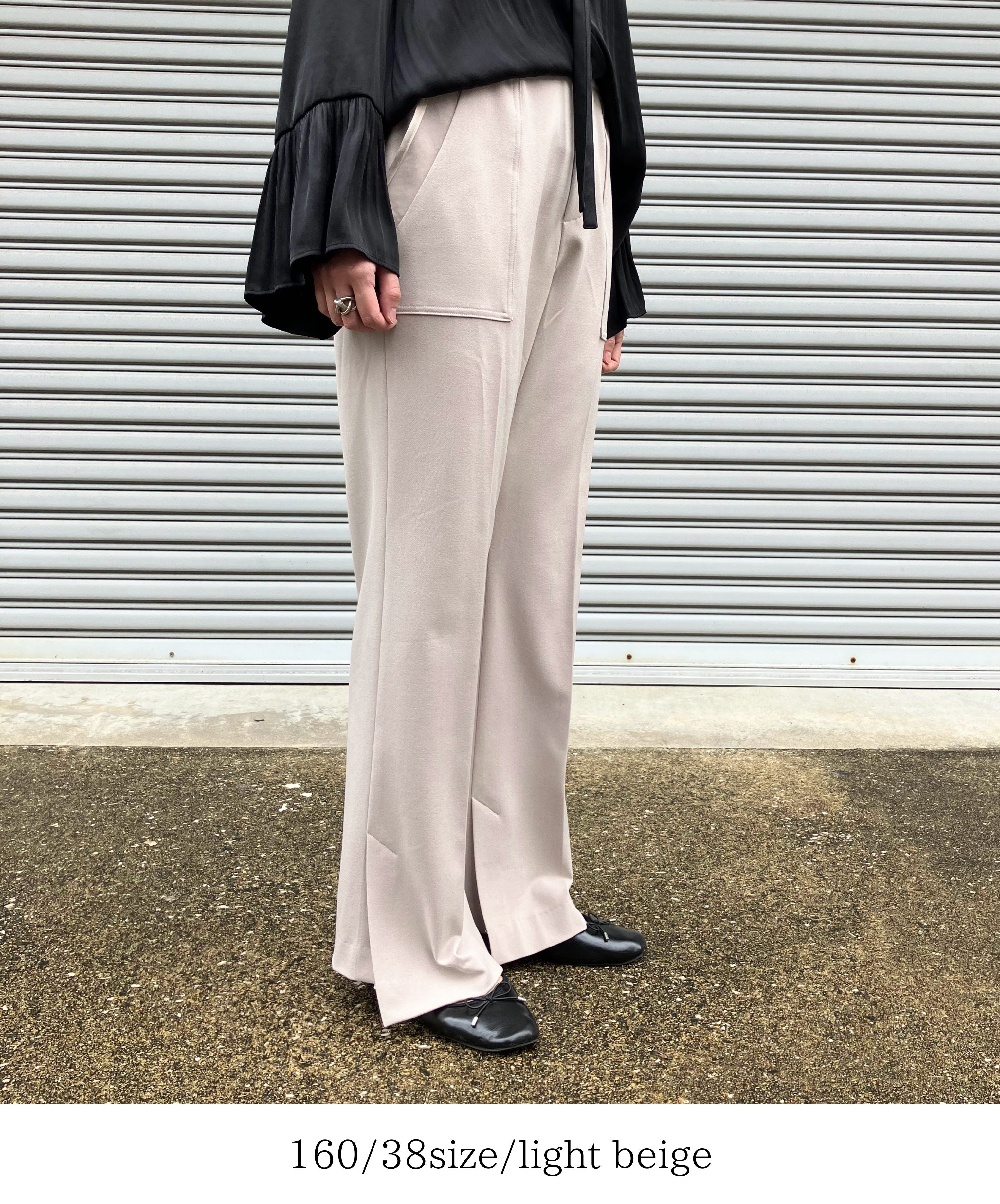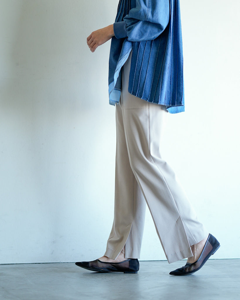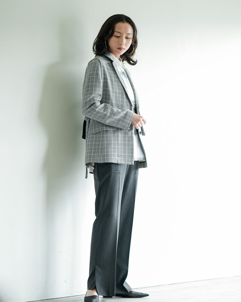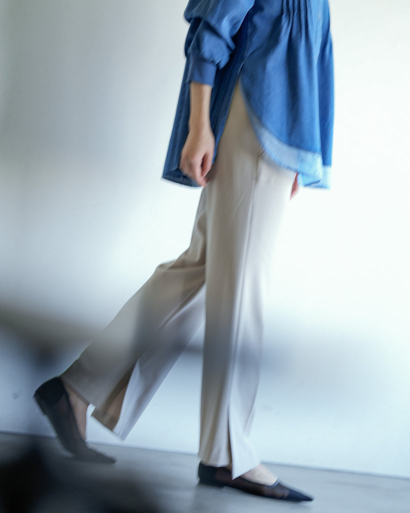 楽な着心地でスタイリッシュ見えなイージーパンツ。ソフトな風合いと優れた保温効果を持つ裏起毛素材で、伸縮性に優れ、蒸れにくくしなやかな肌触りが特徴的です。汗など水分を吸収して熱に変える特性を持つため冬も暖かく着用できます。イージーパンツでは特に気になるシルエットにもこだわり、スタイリングしやすいよう広すぎず細すぎずなストレートシルエットを採用。裾の両サイドに入った開きにはスタイルアップを強調する秘訣が。前裾を長く、後裾を短かくし前後の丈差をつけることで(3cm)踵は付かずとも足の甲の部分まで隠れ延長された視覚効果で脚長に。センタープレスが入りきちんと感を与え、日常の様々なシーンで穿けるあったかベーシックボトムです。