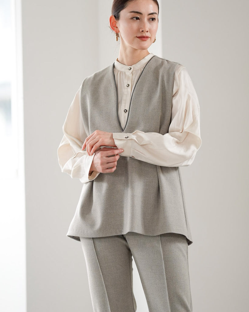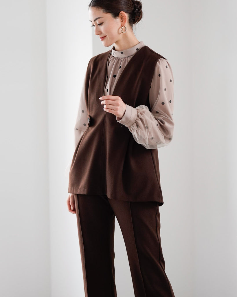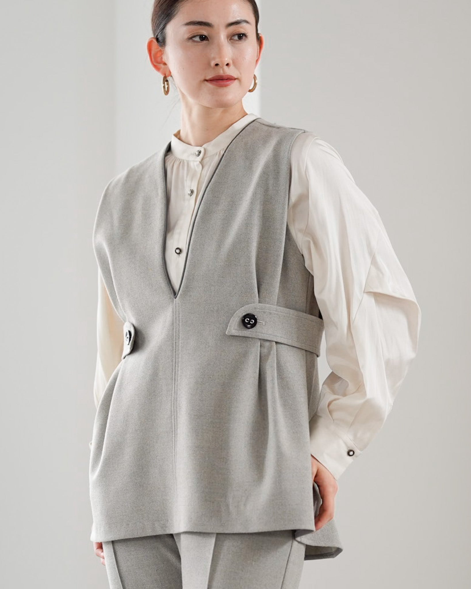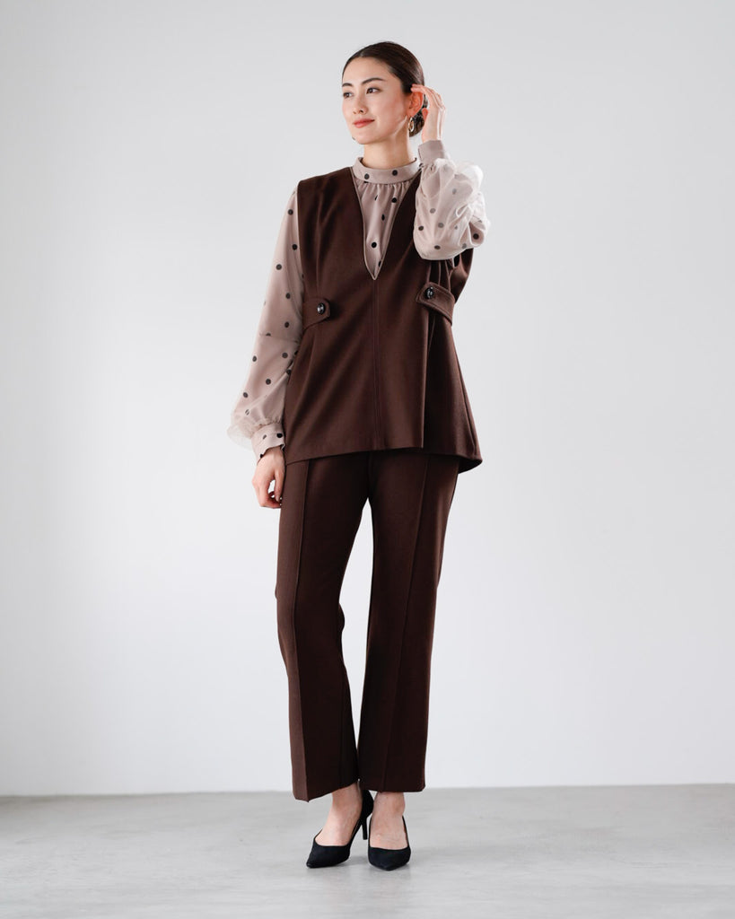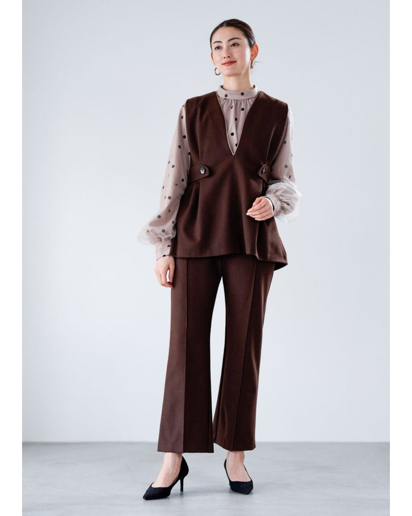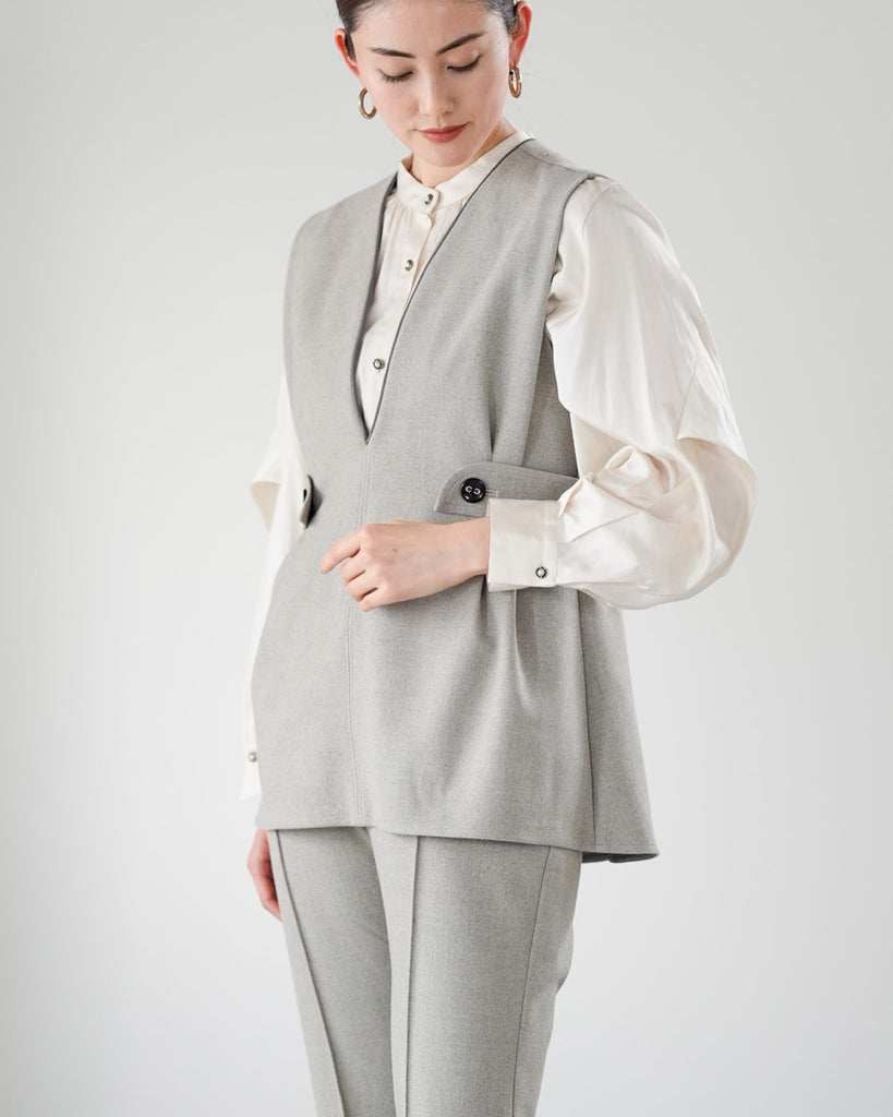 大人の尖りすぎないマニッシュスタイルを作るプルオーバー型ベスト。中肉のジャージー素材を採用し、タテヨコにしっかりきいたストレッチ性が魅力でどんな動きにもしなやかにフィット。軽く動きやすく、ストレスフリーな着心地です。表裏、両面に起毛加工が施されなめらかで滑りが良く、インナーにニットを重ねてももたつきません。被り型のベストはシャツやブラウスの上からカットソー感覚で重ねることができ、気軽に着用可能。深めのVネックが顔まわりをすっきりと見せ、大人の抜け感を演出します。タックによって立体的に作られたフレアシルエットでボディラインを美しく見せてくれ、同素材のフレアパンツとセットアップで着用すれば洗練された大人のマニッシュスタイルが完成。オフィスシーンやイベントごとまで、ジャケットに変わるきちんとアイテムとして活躍します。