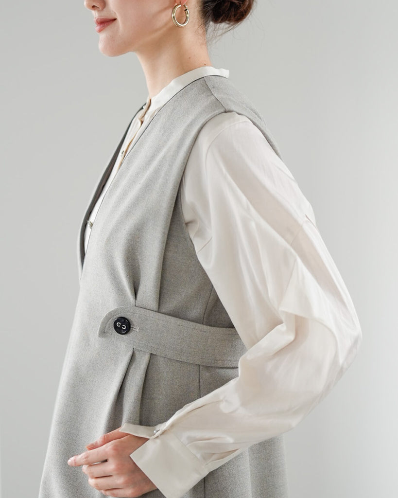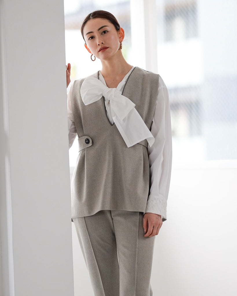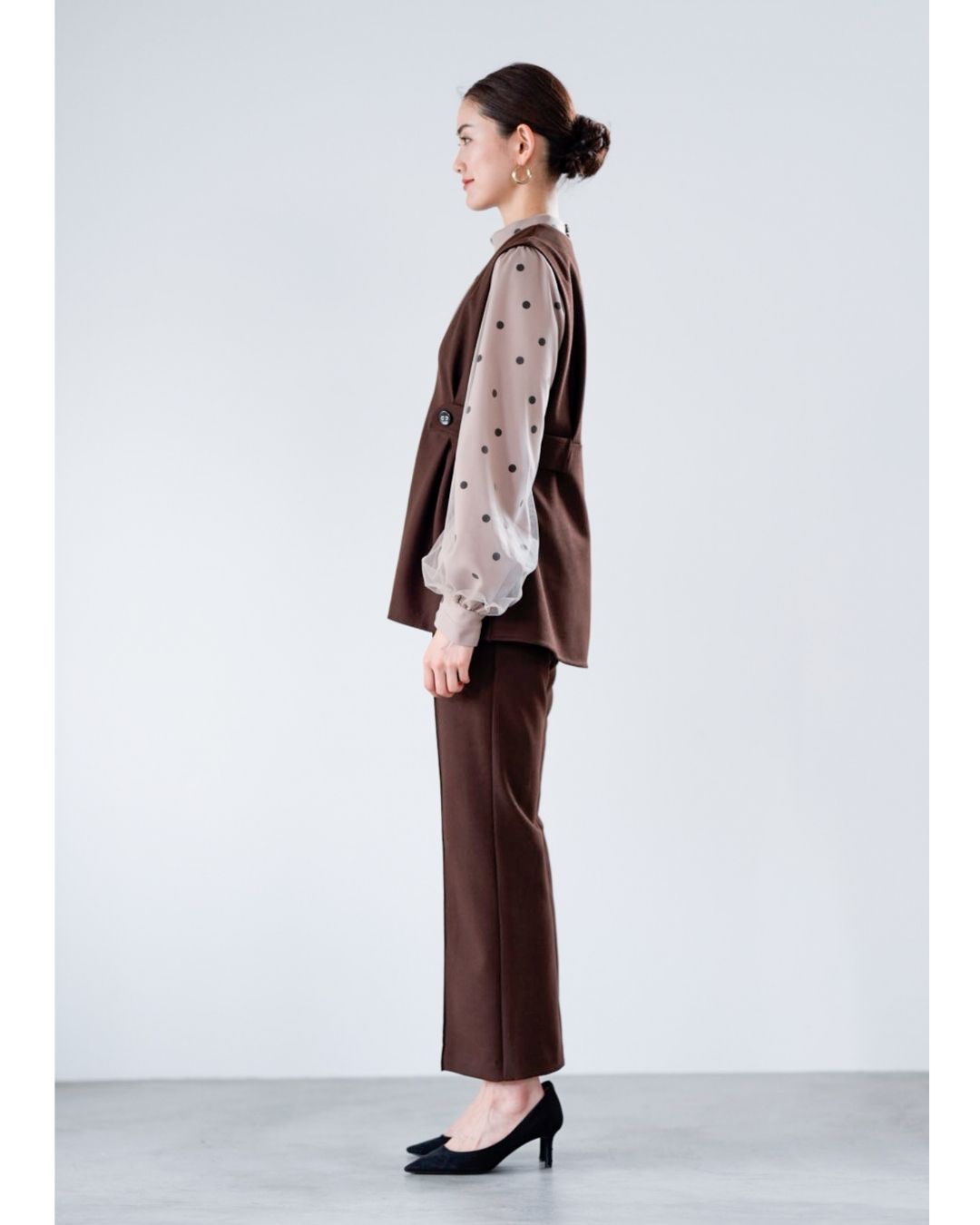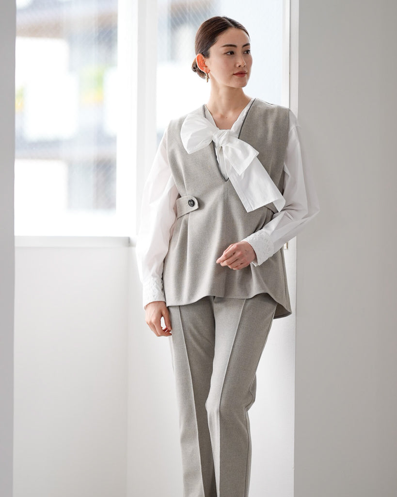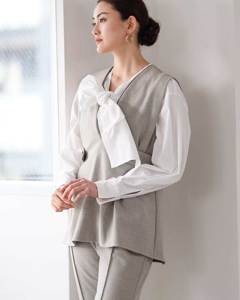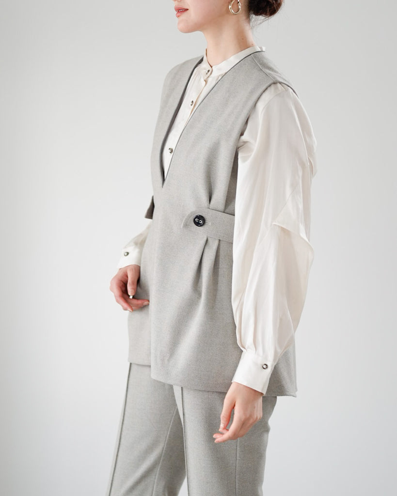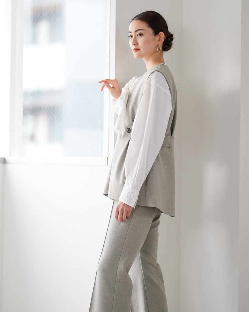 大人の尖りすぎないマニッシュスタイルを作るプルオーバー型ベスト。中肉のジャージー素材を採用し、タテヨコにしっかりきいたストレッチ性が魅力でどんな動きにもしなやかにフィット。軽く動きやすく、ストレスフリーな着心地です。表裏、両面に起毛加工が施されなめらかで滑りが良く、インナーにニットを重ねてももたつきません。被り型のベストはシャツやブラウスの上からカットソー感覚で重ねることができ、気軽に着用可能。深めのVネックが顔まわりをすっきりと見せ、大人の抜け感を演出します。タックによって立体的に作られたフレアシルエットでボディラインを美しく見せてくれ、同素材のフレアパンツとセットアップで着用すれば洗練された大人のマニッシュスタイルが完成。オフィスシーンやイベントごとまで、ジャケットに変わるきちんとアイテムとして活躍します。