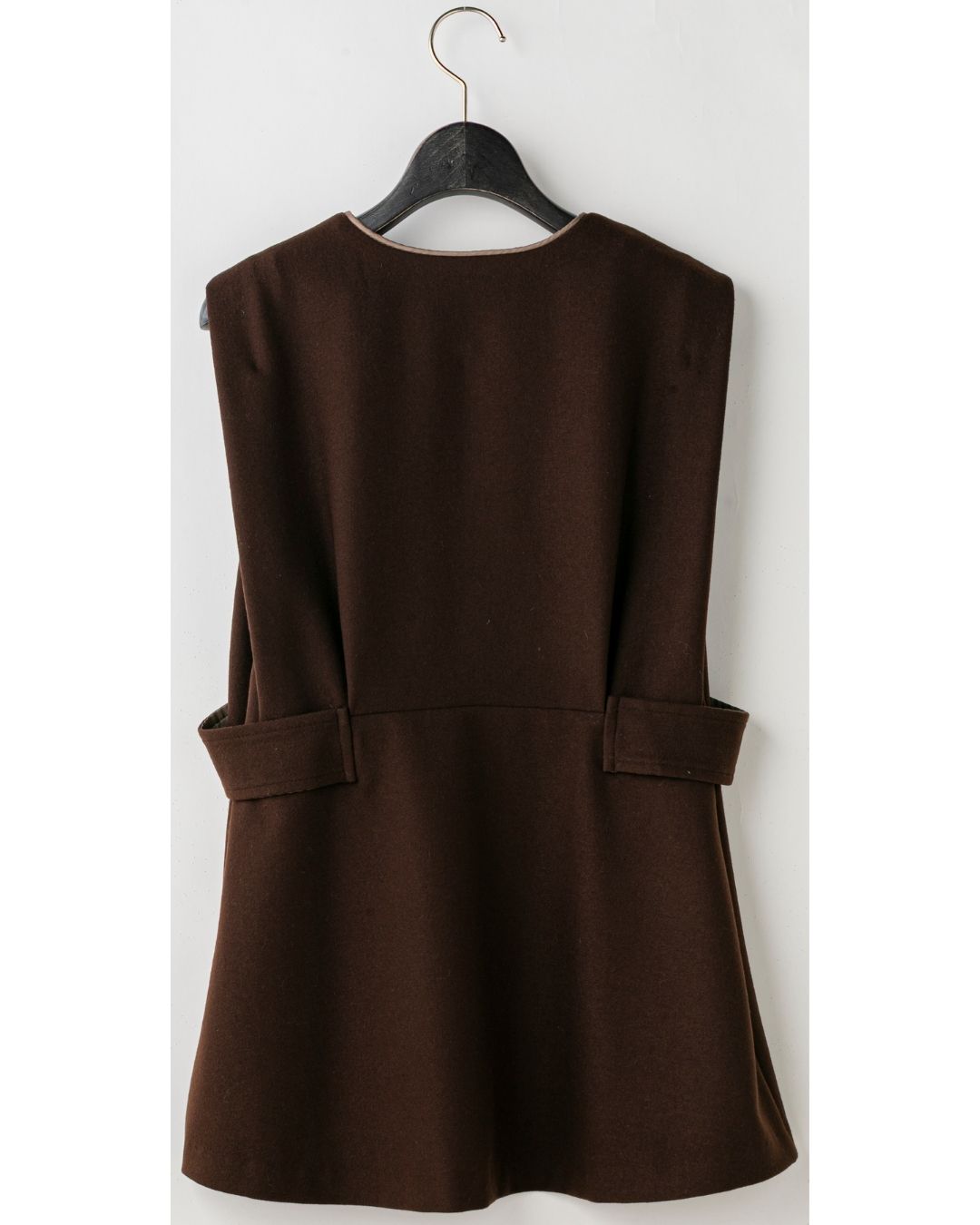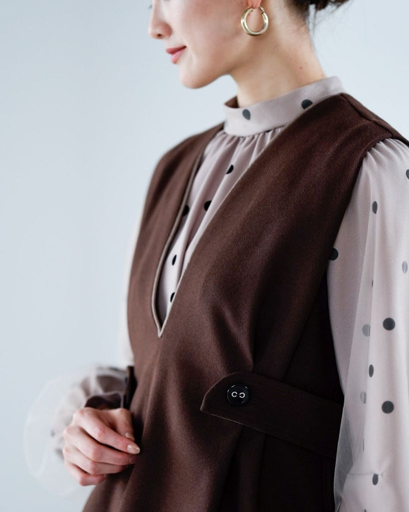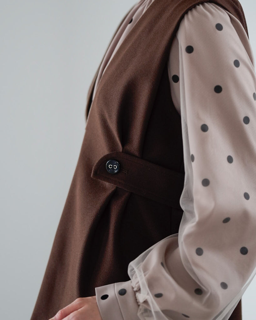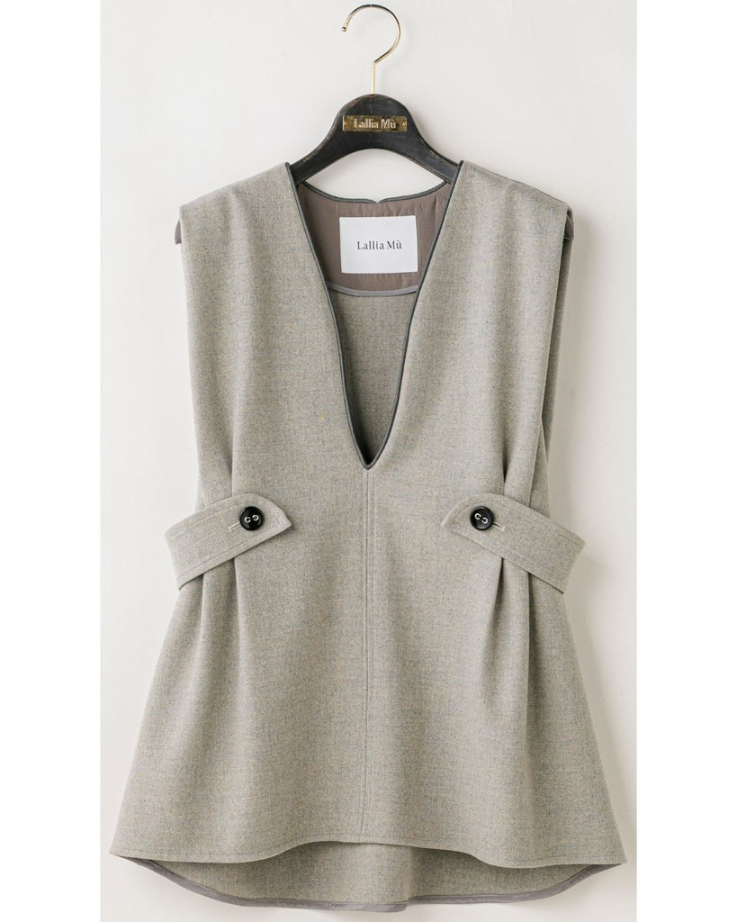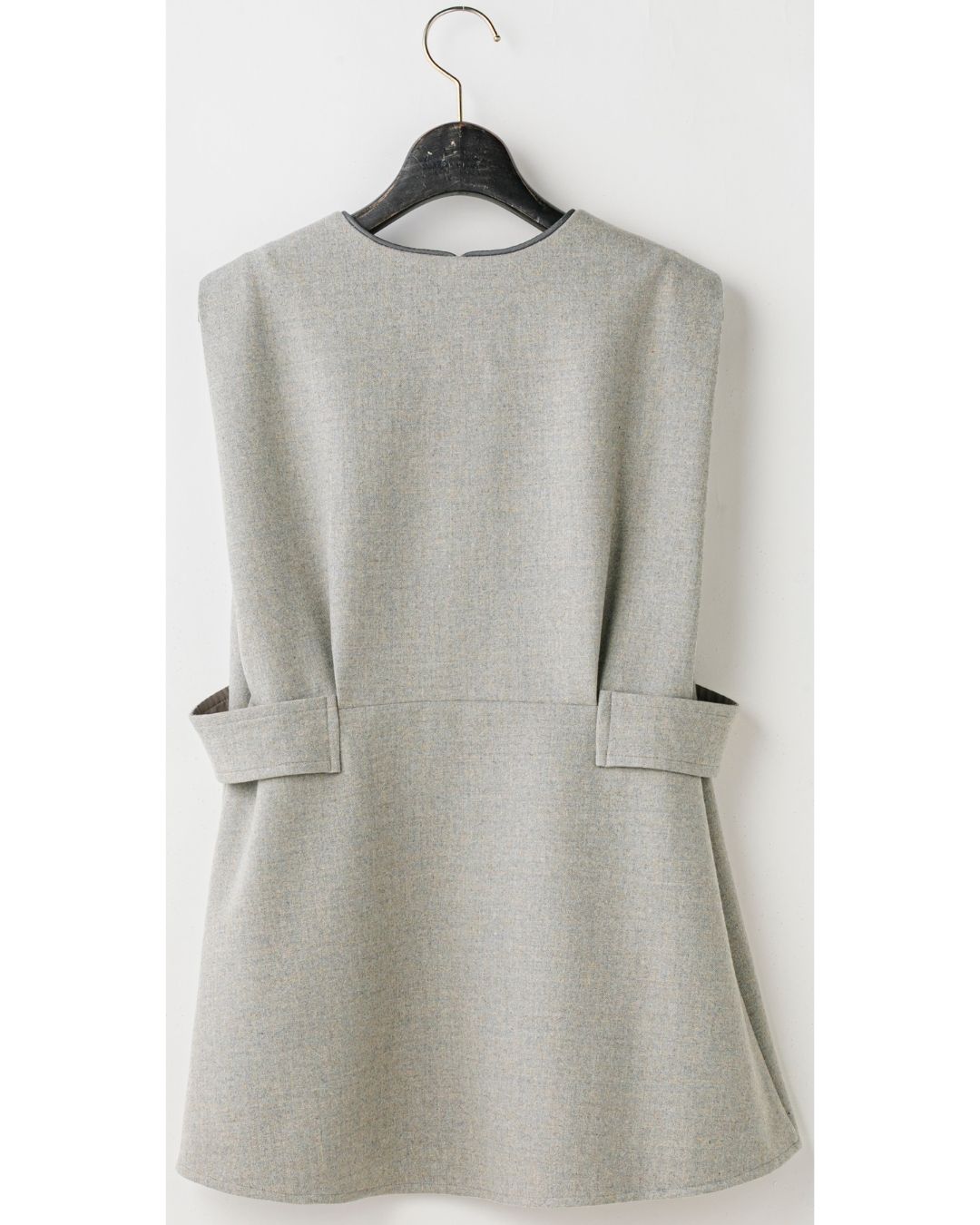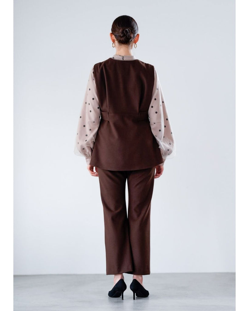 大人の尖りすぎないマニッシュスタイルを作るプルオーバー型ベスト。中肉のジャージー素材を採用し、タテヨコにしっかりきいたストレッチ性が魅力でどんな動きにもしなやかにフィット。軽く動きやすく、ストレスフリーな着心地です。表裏、両面に起毛加工が施されなめらかで滑りが良く、インナーにニットを重ねてももたつきません。被り型のベストはシャツやブラウスの上からカットソー感覚で重ねることができ、気軽に着用可能。深めのVネックが顔まわりをすっきりと見せ、大人の抜け感を演出します。タックによって立体的に作られたフレアシルエットでボディラインを美しく見せてくれ、同素材のフレアパンツとセットアップで着用すれば洗練された大人のマニッシュスタイルが完成。オフィスシーンやイベントごとまで、ジャケットに変わるきちんとアイテムとして活躍します。