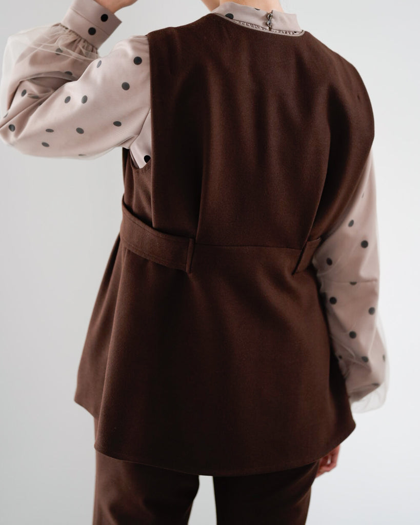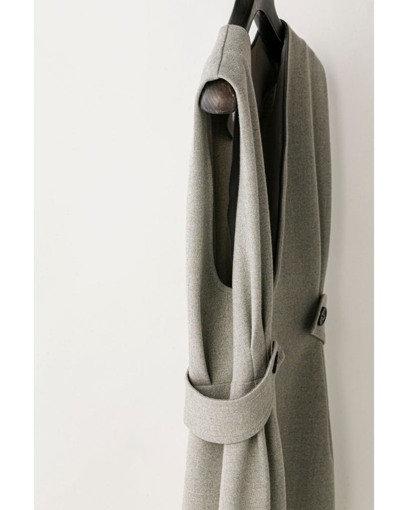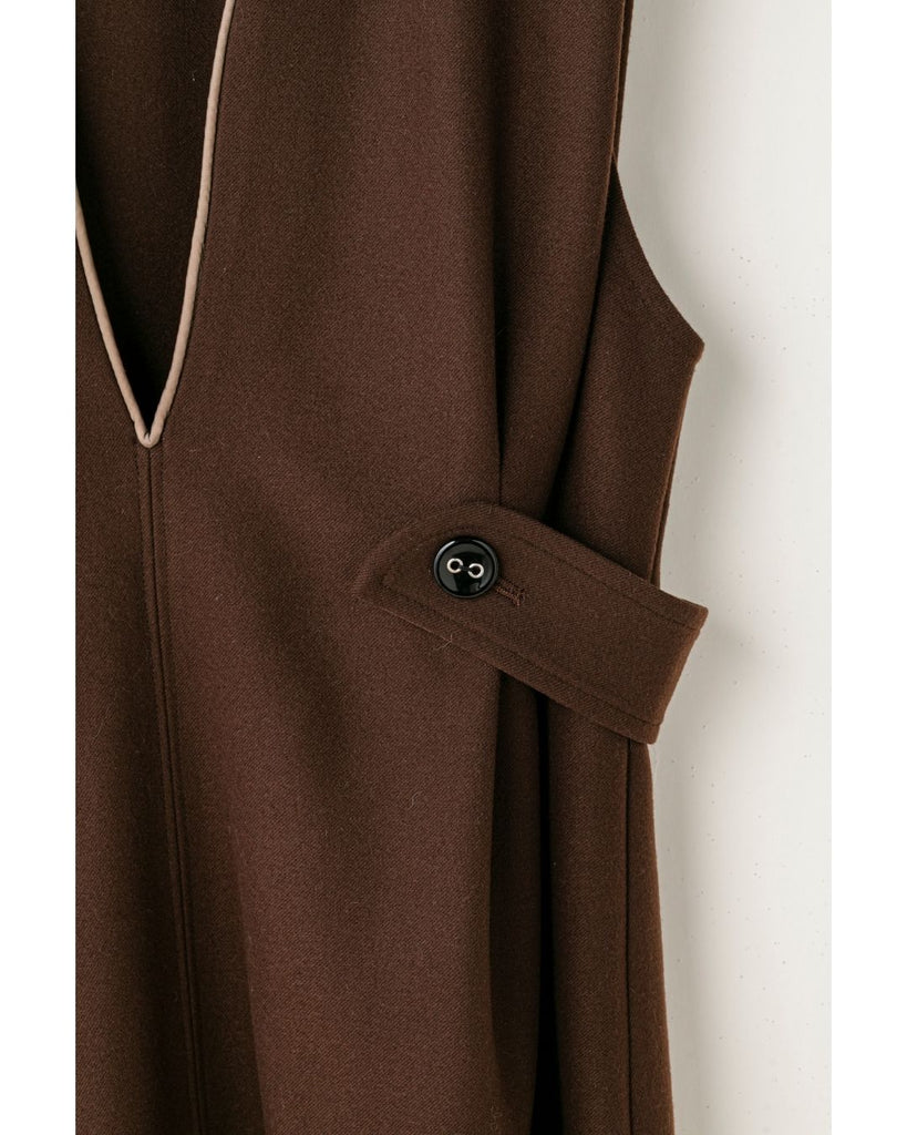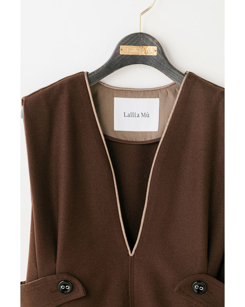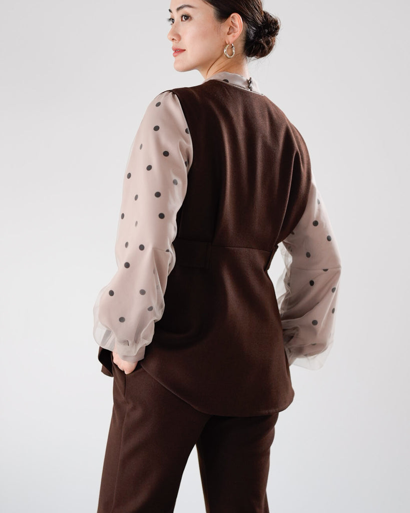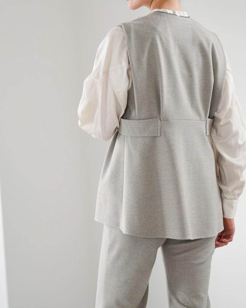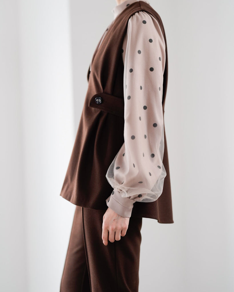 大人の尖りすぎないマニッシュスタイルを作るプルオーバー型ベスト。中肉のジャージー素材を採用し、タテヨコにしっかりきいたストレッチ性が魅力でどんな動きにもしなやかにフィット。軽く動きやすく、ストレスフリーな着心地です。表裏、両面に起毛加工が施されなめらかで滑りが良く、インナーにニットを重ねてももたつきません。被り型のベストはシャツやブラウスの上からカットソー感覚で重ねることができ、気軽に着用可能。深めのVネックが顔まわりをすっきりと見せ、大人の抜け感を演出します。タックによって立体的に作られたフレアシルエットでボディラインを美しく見せてくれ、同素材のフレアパンツとセットアップで着用すれば洗練された大人のマニッシュスタイルが完成。オフィスシーンやイベントごとまで、ジャケットに変わるきちんとアイテムとして活躍します。
